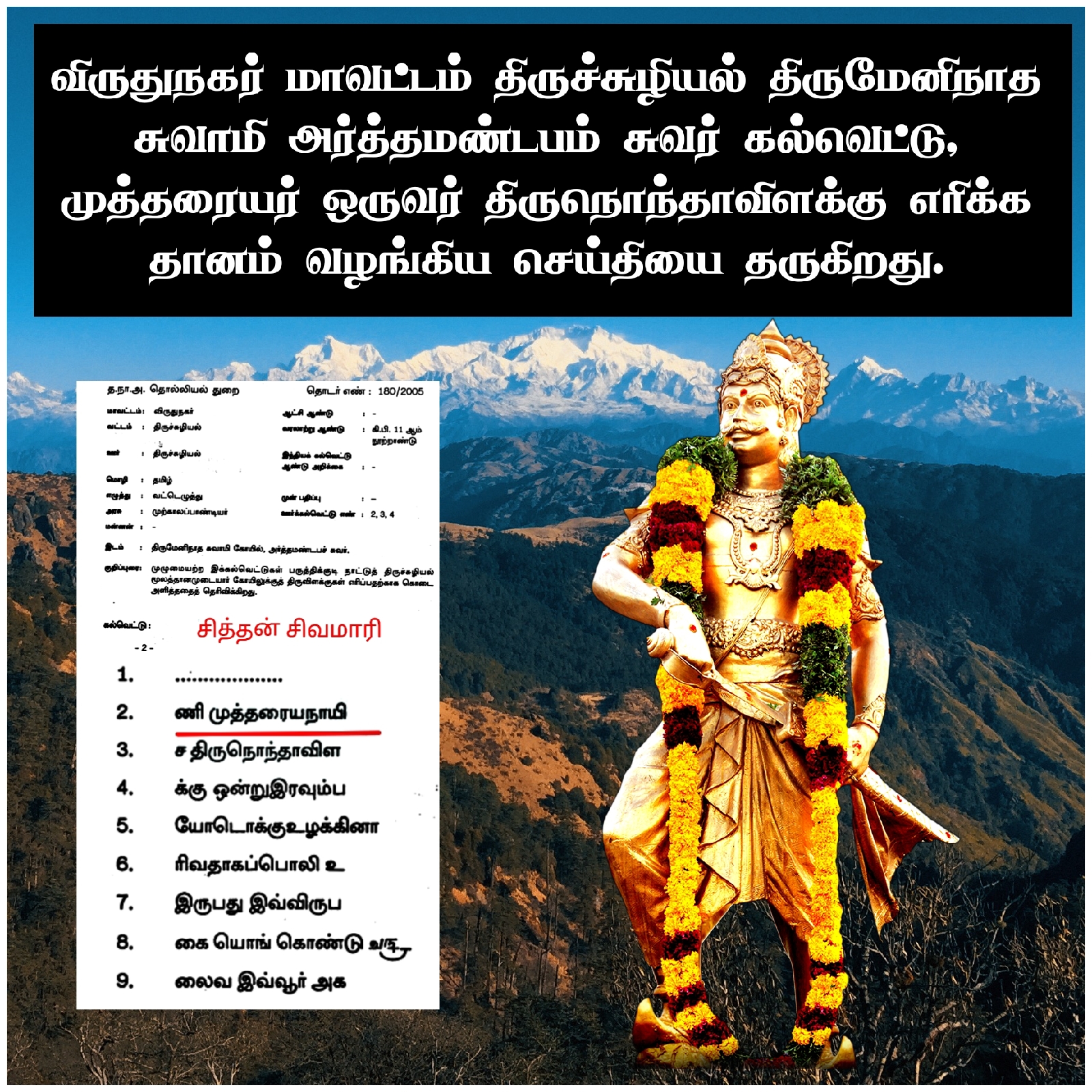9.விருதுநகர் மாவட்டம் திருச்சுழியல் திருமேனிநாத சுவாமி அர்த்தமண்டபம் சுவர் கல்வெட்டு, முத்தரையர் ஒருவர் திருநொந்தாவிளக்கு எரிக்க தானம் வழங்கிய செய்தியை தருகிறது.